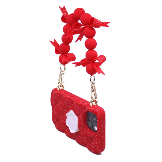 iPhone 13 Mini Bright Red Seal Stamped Case with Glitters and Ribbon Strap